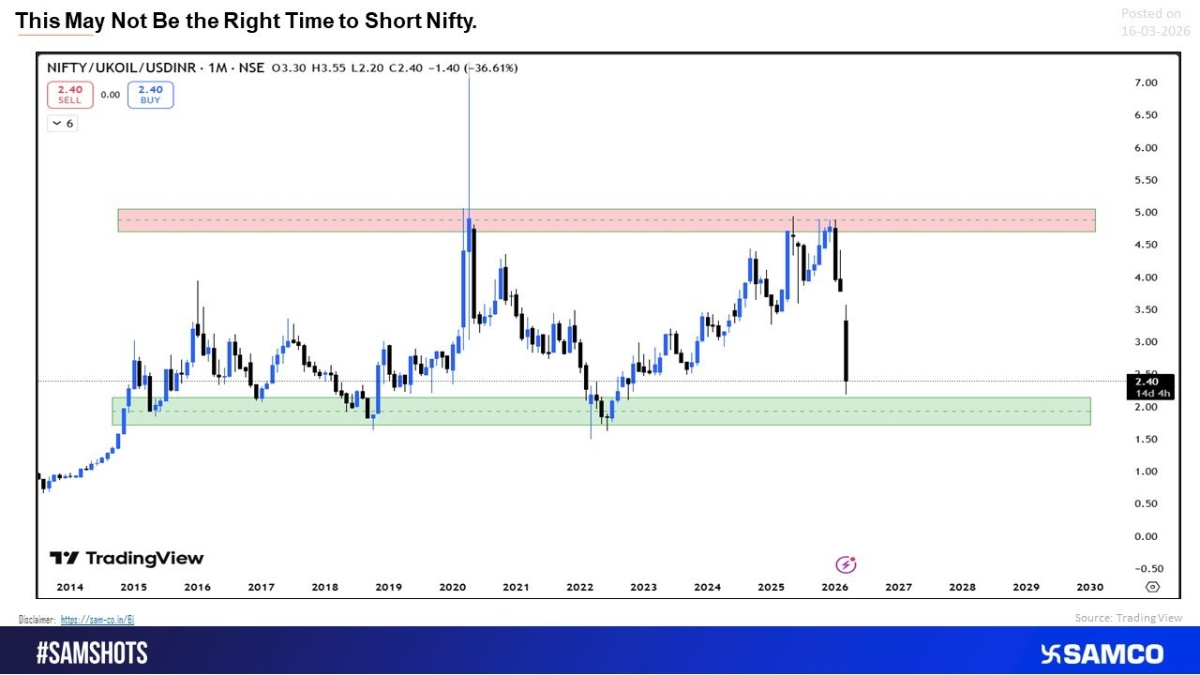 The recent sharp decline in the ratio appears largely driven by a spike in global crude prices, particularly Brent Crude Oil. If crude prices stabilize or decline, the ratio could rebound even if Nifty remains broadly stable.