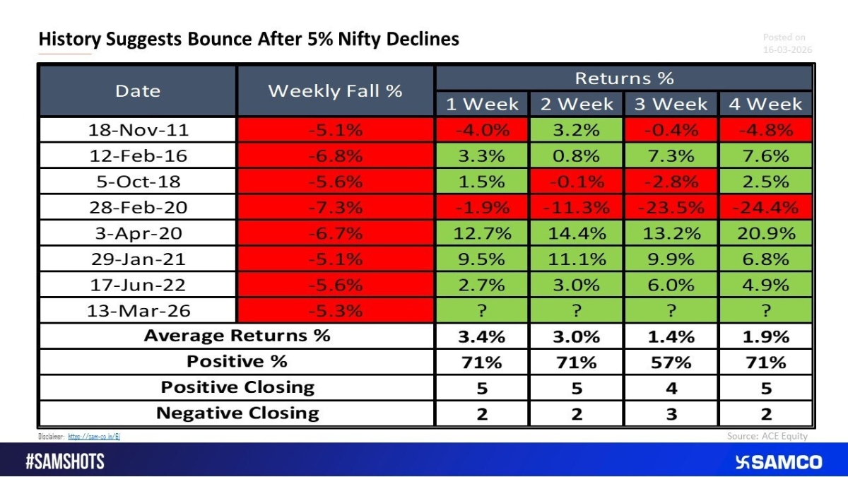 The latest instance on 13 March 2026, when the Nifty fell 5.3 per cent for the week, places the market at a historically similar setup.