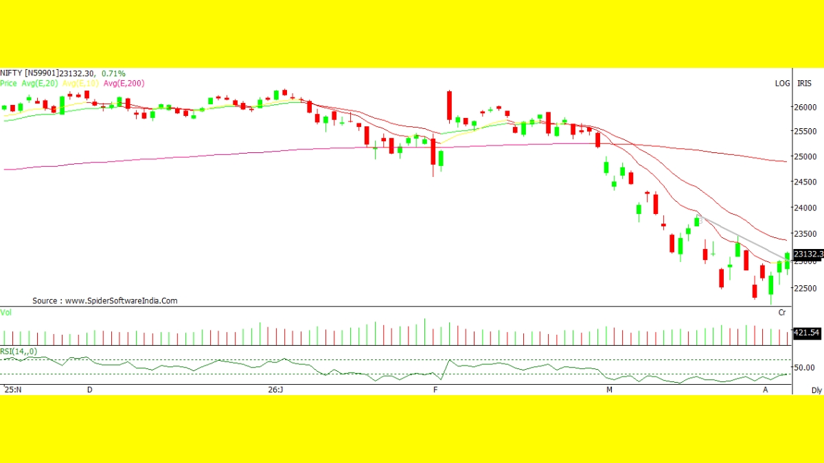 Nifty daily chart shows the formation of a long bull candle with lower shadow. Technically, this market action indicates an attempt at a decisive breakout of the crucial hurdle around 23000 levels. This is a positive indication and the sharp bounce back of the last three sessions signals the formation of a crucial bottom reversal pattern in Nifty at the recent low of 22182.