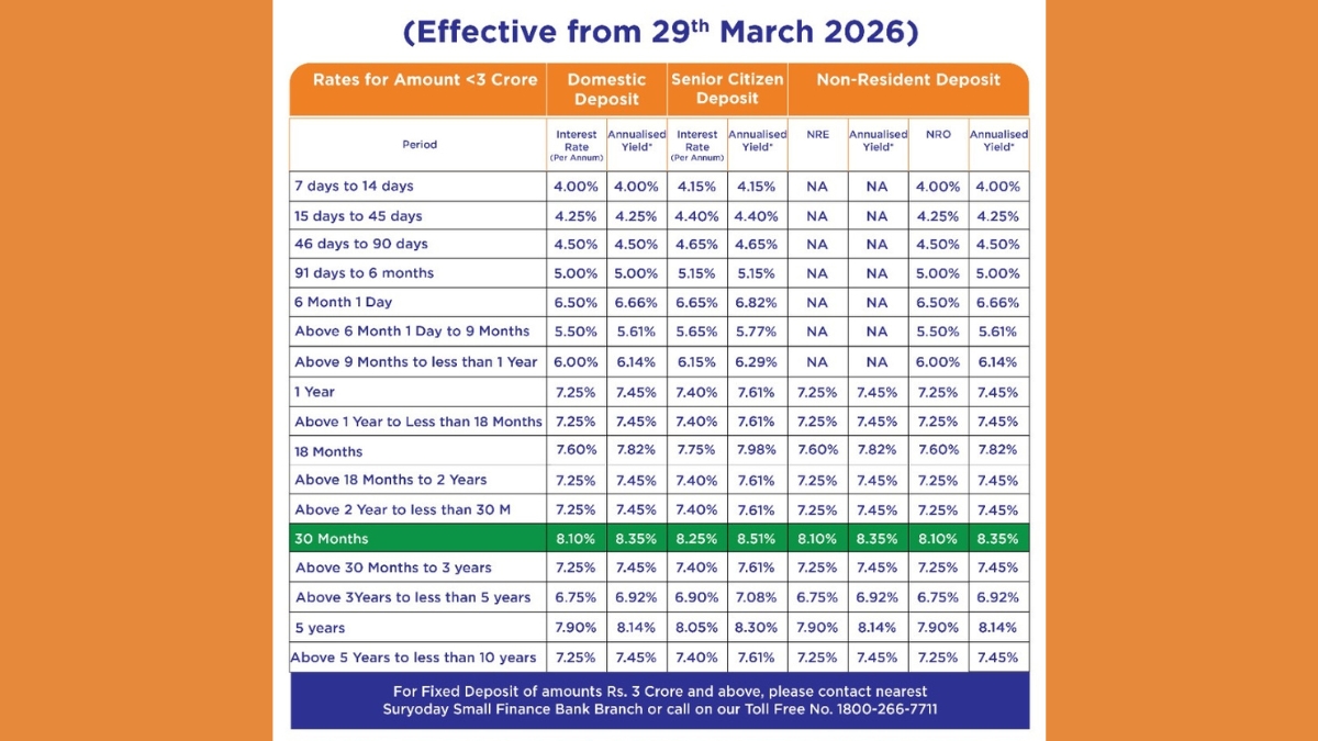 Suryoday Small Finance Bank FD Rates: Suryoday Small Finance Bank (SSFB) has announced a revision in its Fixed Deposit (FD) interest rates. The new FD rates are effective March 29, 2026.