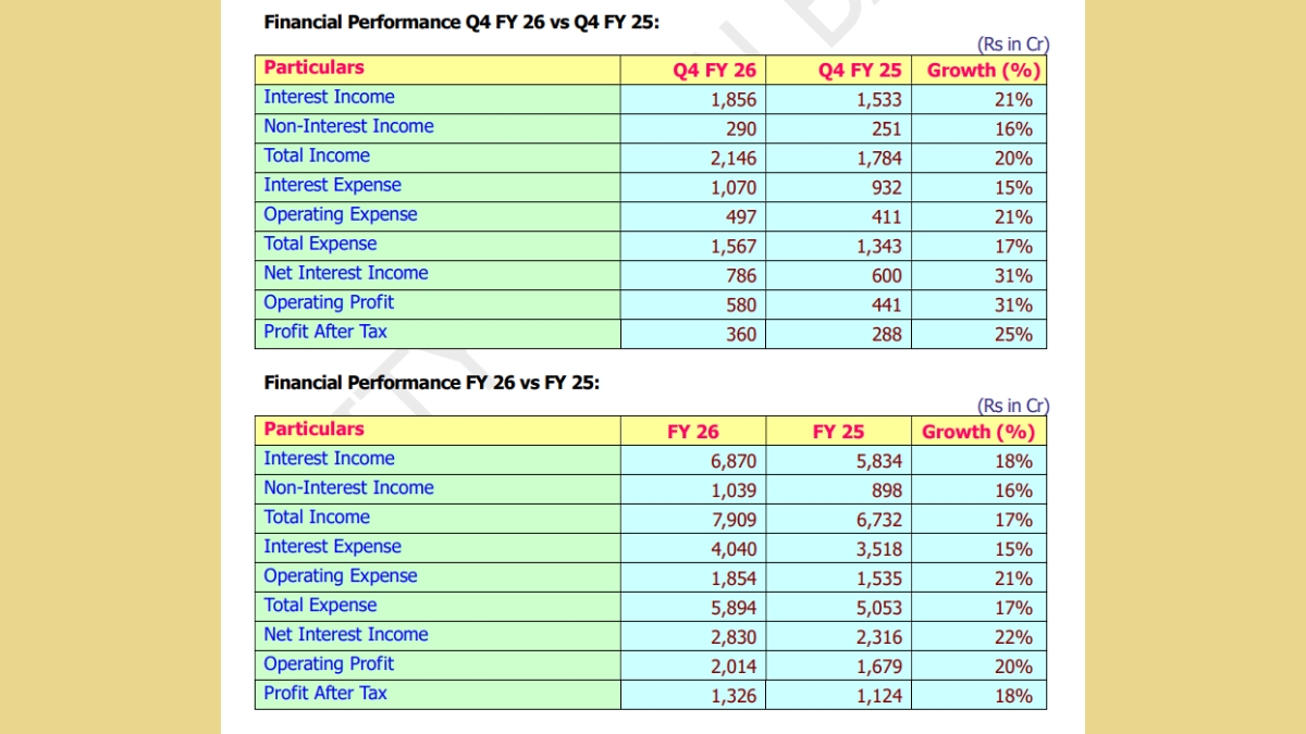 Deposits: Total deposits up by 23% to Rs 78,308 Cr in FY 26 from Rs 63,526 cr in the corresponding period last year