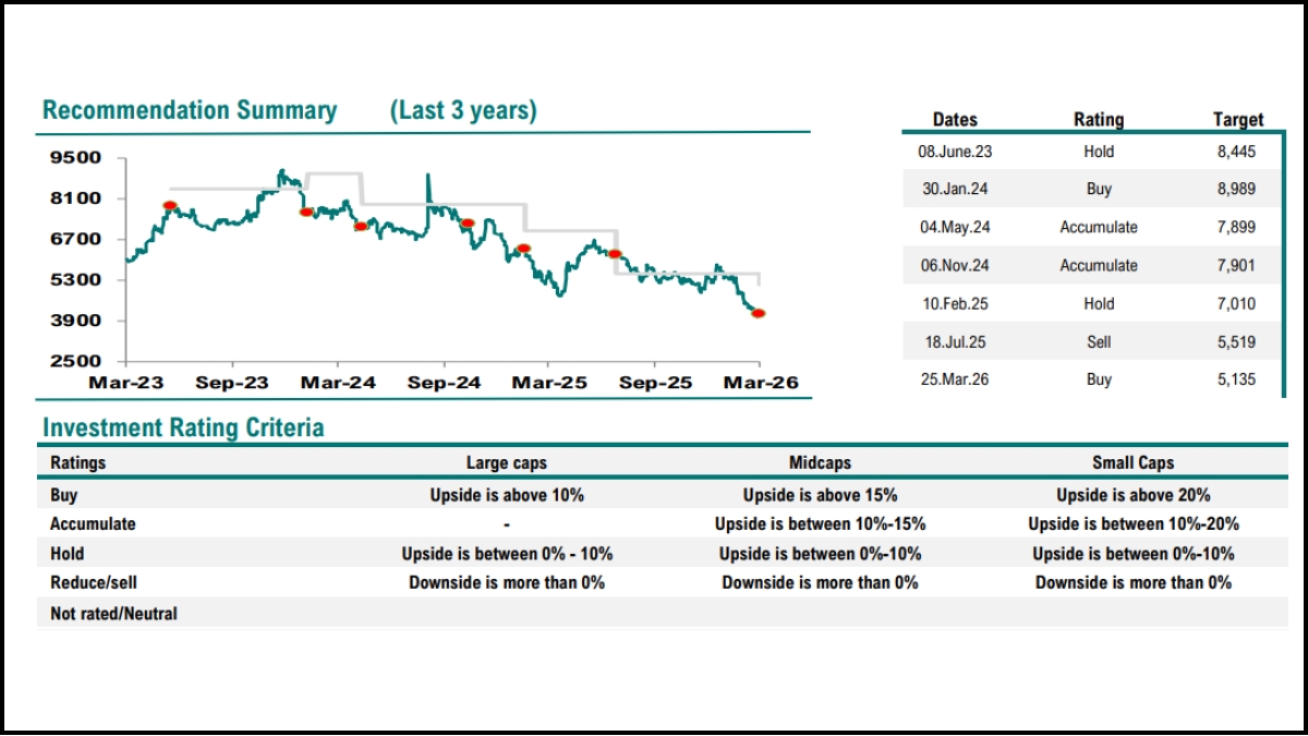 Geojit said that it values Tata Elxsi at 33x FY28E EPS and recommends BUY rating, with a target price of Rs 5,135. The target price offers an upside of 20 per cent from Wednesday's (March 25) closing price of Rs 4,204.50.