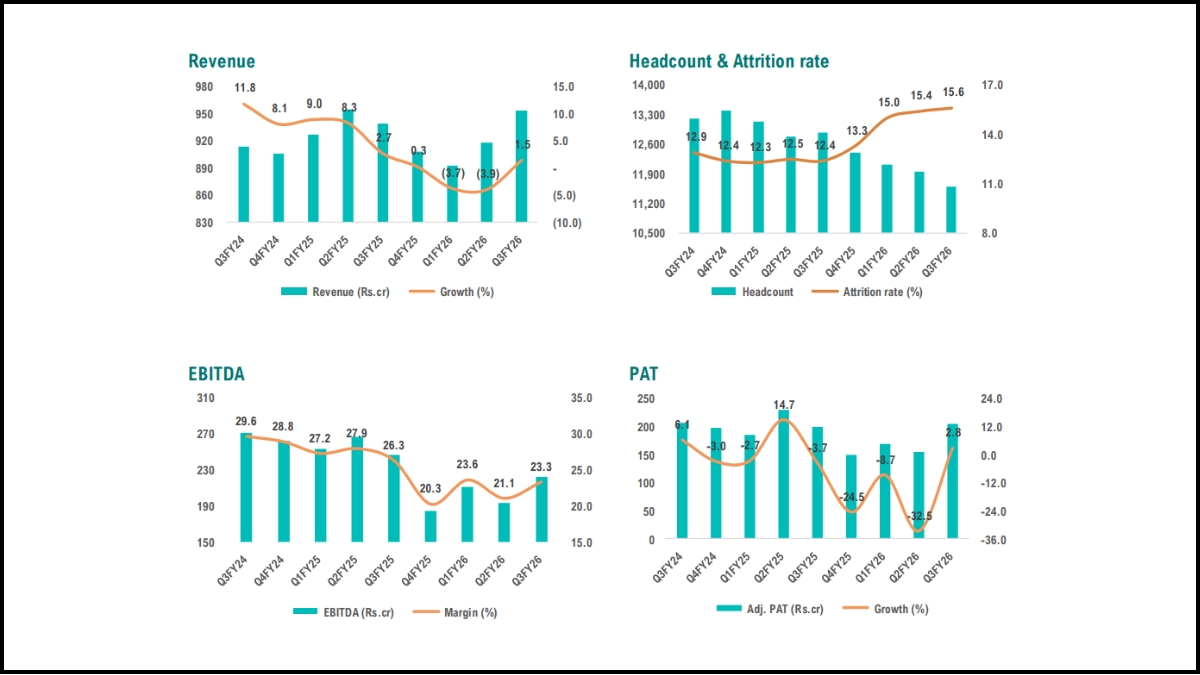 Geojit said that Tata Elxsi posted a 2% per cent YoY revenue decline in 9MFY26, while sequential recovery was visible with 3.9 per cent growth. This was led by a 7.7 per cent rebound in Transportation on SDV-driven OEM ramp-ups and normalization of key client engagements.